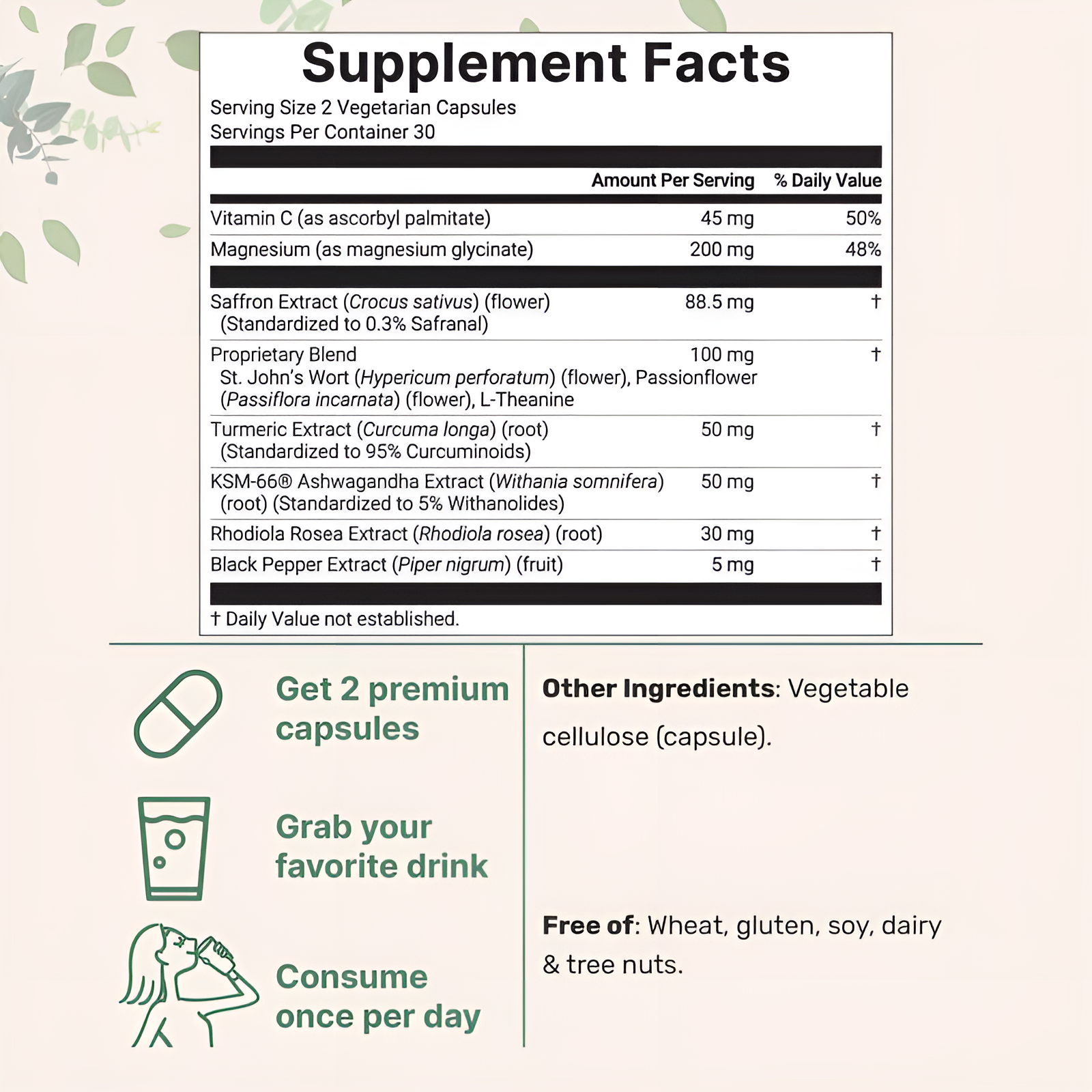 Our advanced saffron formula combines nature’s most trusted mood and mind supporters—Saffron, Turmeric, Ashwagandha, and more—to help you feel emotionally lighter, mentally sharper, and physically more at ease. This clean, plant-powered blend works from the inside out to naturally reduce stress, support serotonin levels, and promote calm, clarity, and daily resilience—without fillers, synthetics, or side effects.